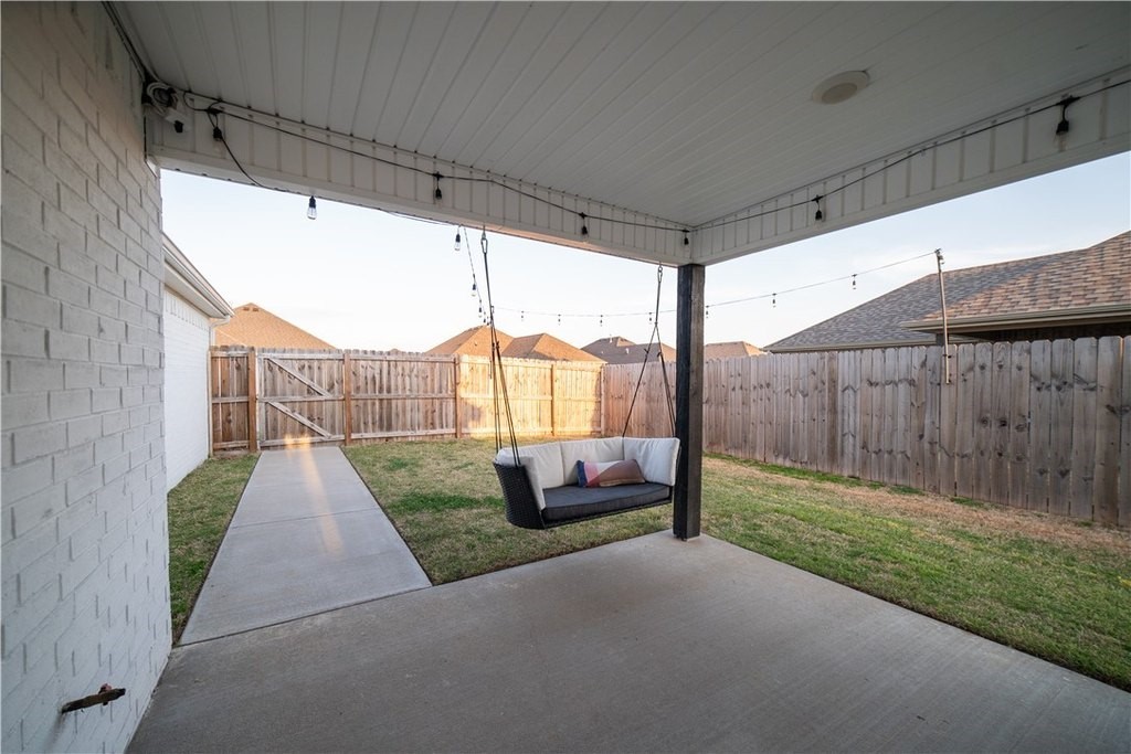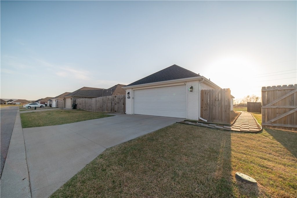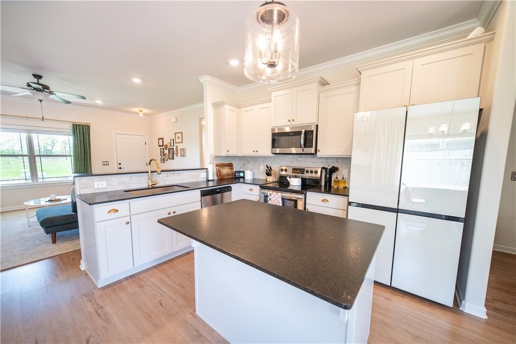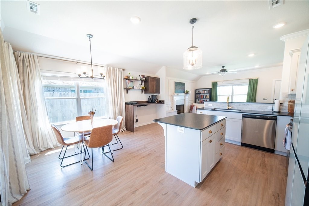 Modern, clean, low-maintenance open floorplan living in a highly convenient West Fayetteville located close to everything. The wide open living room offers space to relax and enjoy the large windows and wood encased fireplace with a custom, picture framed wood accent wall. Cool tech feature with smart light switches throughout. The large kitchen offers an island, plenty of white cabinets with gorgeous black granite and gold hardware. Stainless appliances, pantry, decorative refrigerator and creative coffee bar make this kitchen a dream. Big primary features ensuite with dual vanities and large walk-in-closet. Two more bedrooms with custom touches! Enjoy great curb appeal with lime washed brick - not painted and a unique, symmetrical walkway leading from drive to front door. Nestled in a friendly neighborhood featuring ponds, walking trails and nearby parks. Minutes to the University of Arkansas and I-49. Covered back porch is a perfect place to chill and relax. Security cameras, fridge, washer and dryer all convey.