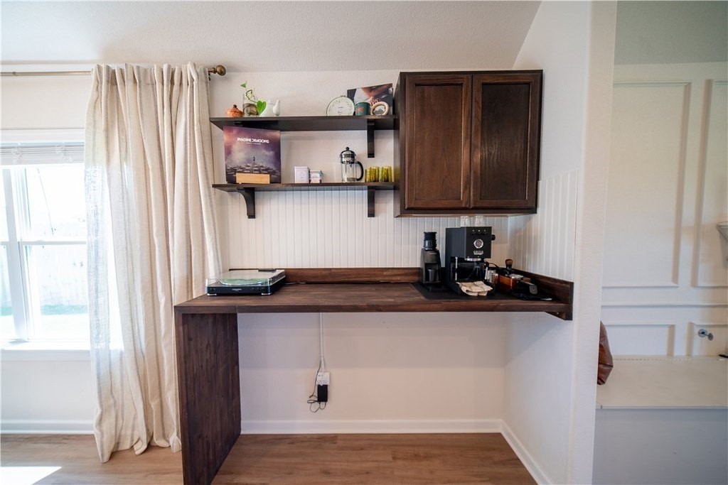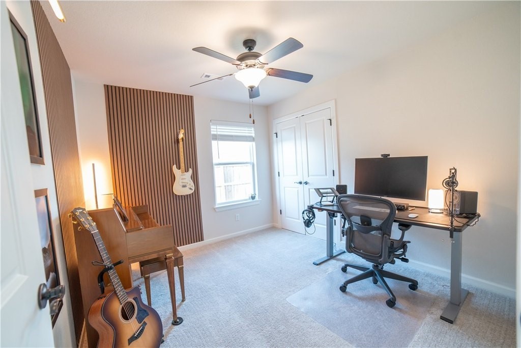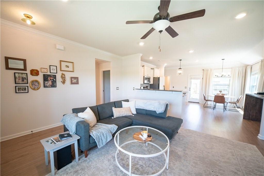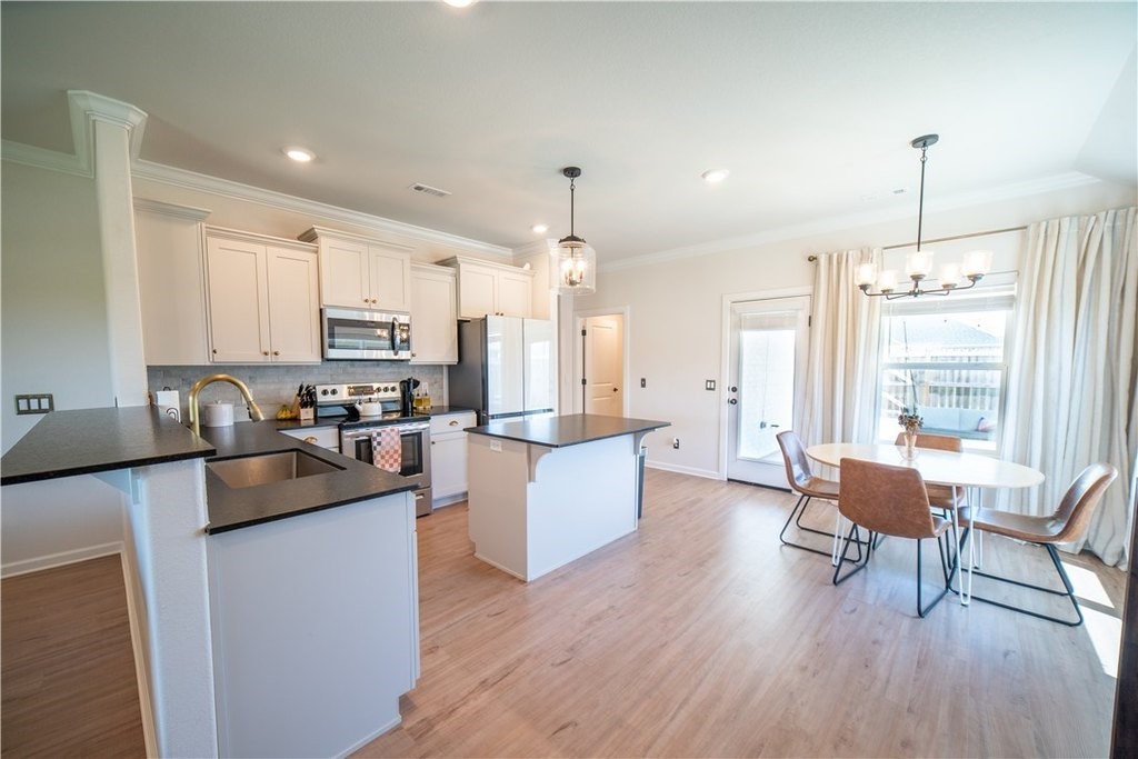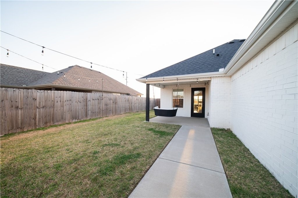 Modern, clean, low-maintenance open floorplan living in a highly convenient West Fayetteville located close to everything. The wide open living room offers space to relax and enjoy the large windows and wood encased fireplace with a custom, picture framed wood accent wall. Cool tech feature with smart light switches throughout. The large kitchen offers an island, plenty of white cabinets with gorgeous black granite and gold hardware. Stainless appliances, pantry, decorative refrigerator and creative coffee bar make this kitchen a dream. Big primary features ensuite with dual vanities and large walk-in-closet. Two more bedrooms with custom touches! Enjoy great curb appeal with lime washed brick - not painted and a unique, symmetrical walkway leading from drive to front door. Nestled in a friendly neighborhood featuring ponds, walking trails and nearby parks. Minutes to the University of Arkansas and I-49. Covered back porch is a perfect place to chill and relax. Security cameras, fridge, washer and dryer all convey.